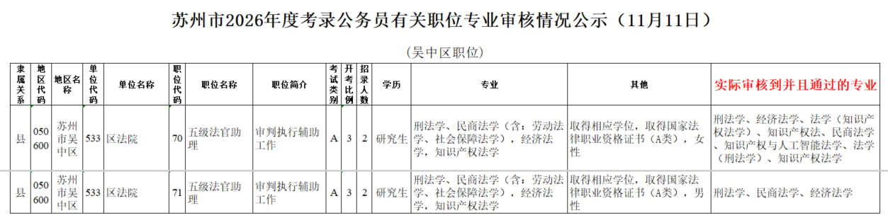 苏州市吴中区2026年度考录公务员有关职位专业审核情况公示(11月11日)